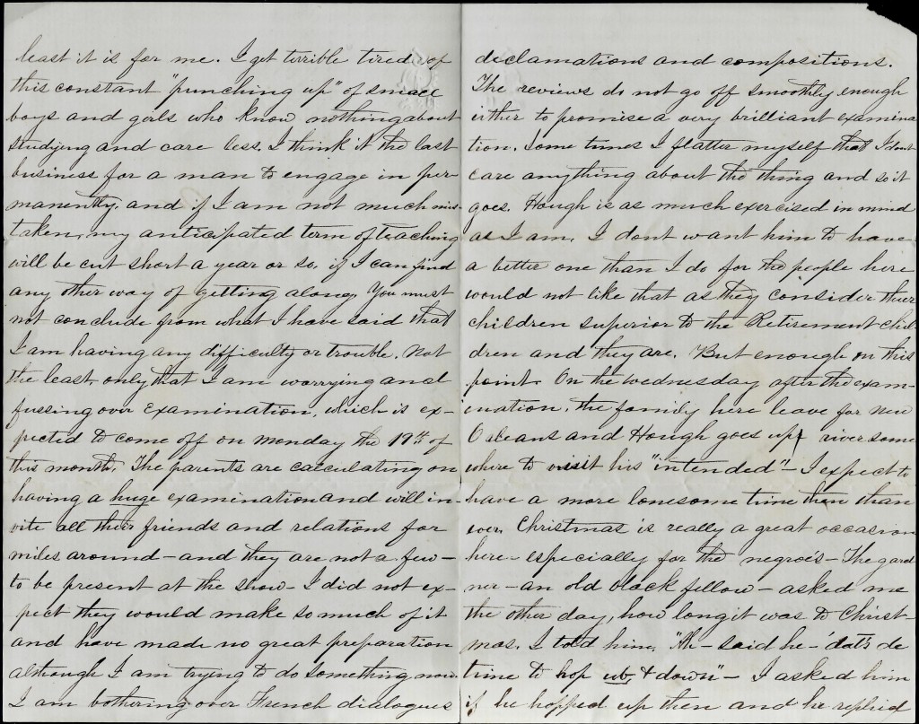 You must not conclude from what I have said that I am having any difficulty or trouble. Not the least. Only that I am worrying and fussing over examination, which is expected to come off on Monday the 19th of this month. The parents are calculating on having a huge examination and will invite all their friends and relations for miles around—and they are not a few—to be present at the show. I did not expect they would make so much of it and have made no great preparation although I am trying to so something now. I am bothering over French dialogues, declamations, and compositions. The reviews do not go off smoothly enough either to promise a very brilliant examination.