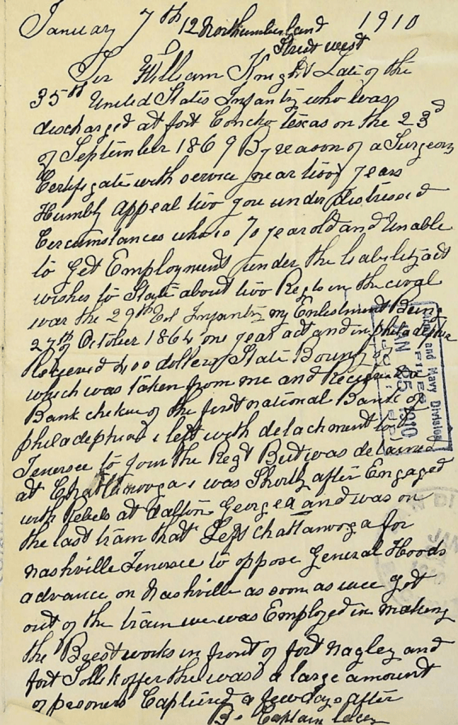 William Knight, late of the 35th United States Infantry, who was discharged at Fort Concho, Texas, on the 23rd of September 1869 by reason of a surgeon’s certificate with service near two years humbly appeals to you under distressed circumstances who is 70 years old and unable to get employment under the liability act, wishes to state about two regiments in the Civil War—the 29th [Pennsylvania] Vol. Infantry, my enlistment being 27 October 1864 one year and in Philadelphia, received 400 dollars state bounty of which was taken from me and received a bank check on the First Nation Bank of Philadelphia & left with a detachment to Tennessee to join the regiment but was detained at Chattanooga & was shortly after engaged with rebels at Dalton, Georgia, and was on the last train that left Chattanooga for Nashville, Tennessee to oppose General Hood’s advance on Nashville. As soon as we got out of the train, we was employed in making the breastworks in front of Fort Negley and Fort Zollicoffer. There was a large amount of prisoners captured a few days after.