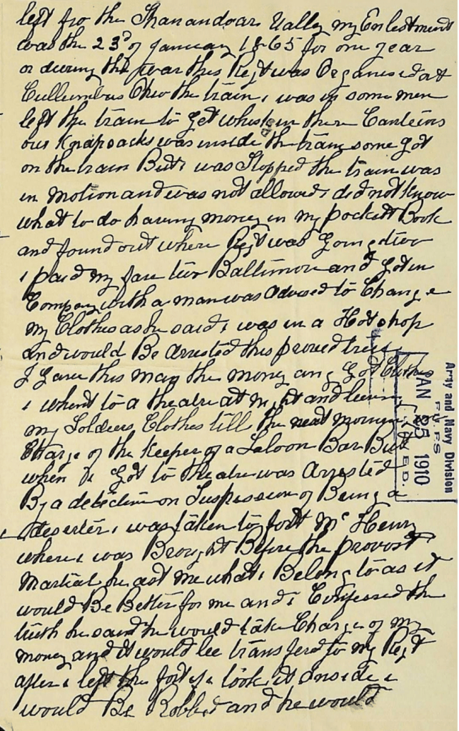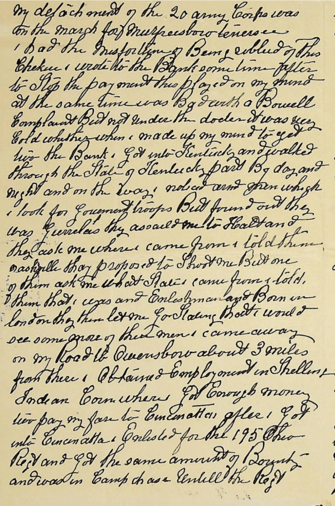 [While] my detachment of the 20th Army Corps was on the march for Murfreesboro, Tennessee, I had the misfortune of being robbed of this check. I wrote to the bank sometime after to stop the payment. This played on my mind. At the same time I was bad with a bowel complaint but not under the doctor’s [care]. It was very cold weather when I made up my mind to get to the bank. [Deserting, I] got into Kentucky and walked through the State of Kentucky, part by day and night and on the way noticed armed men which [I believed were on the] look [out] for government troops, but found out they was guerrillas. They asked me to halt and they asked me where I came from & [I] told them Nashville. They proposed to shoot me but one of them that was an Englishman and born in London [intervened and] they let me go stating that I would see more of these men. I came away on my road to Owensboro about three miles from there and obtained employment in shelling Indian corn where I got enough money to pay my fare to Cincinnati.