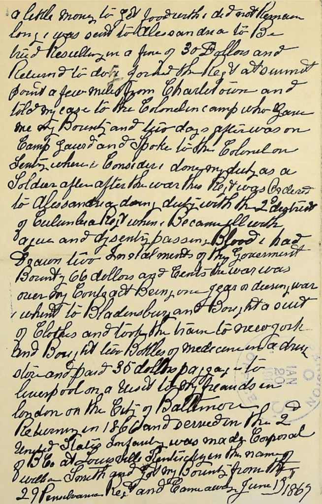 I did not remain long. I was sent to Alexandria to be tried [for desertion] resulting in a fine of 30 dollars and returned to duty. I joined the regiment at Summit Point a few miles from Charlestown and told my case to the Colonel in camp who gave me my bounty and two days after was on Camp Guard and spoke to the Colonel on sentry where I considered I done my duty as a soldier. After the war [ended], the regiment was ordered to Alexandria doing duty with the 2nd District of Columbia Regiment when I became ill with ague and dysentery, passing blood. I had drawn two installments of my government bounty (66 dollars). The war was over—my contract being one year or during the war—I went to Bladensburg and bought a suit of clothes and took the train to New York and bought ten bottles of medicine in a drug store and paid 35 dollars passage to Liverpool on a visit to my friends in London on the City of Baltimore and returning in 1866 and served in the 2nd United States Infantry [where I] was made corporal of Co. B at Louisville, Kentucky under the name of William Smith and got my bounty from the 29th Pennsylvania Regt. and came away June 19, 1869.