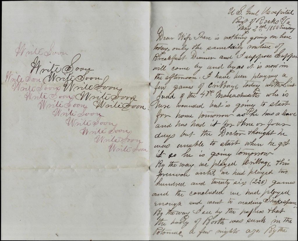 There is nothing going on here today, only the same daily routine of breakfast, dinner, and I suppose supper will come by and by as it is now in the afternoon. I have been playing a few games of cribbage today with Lieut. [Eugene] Judd of the 40th Massachusetts who is here wounded but is going to start for home tomorrow as he has a leave and has had it for three or four days but the doctor thought he was unable to start when he got it so he is going tomorrow. By the way, we played cribbage this forenoon until we had played two hundred and twenty six (226) games and then concluded we had played enough and went to reading Shakespeare.