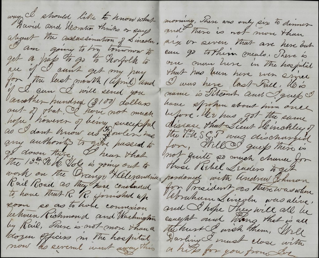 By the way, I see by the papers that the body of Booth was sunk in the Potomac a few nights ago. By the way, I should like to know what David and Horatio thinks or says about the assassination of Lincoln. I am going to try tomorrow to get a pass to go to Norfolk to see if I can’t get my pay for the last month (April) and if I can, I will send you another hundred ($100) dollars out of that. I have not much hope, however, of being successful as I don’t know as Fowler has any authority to give passes to go down there.