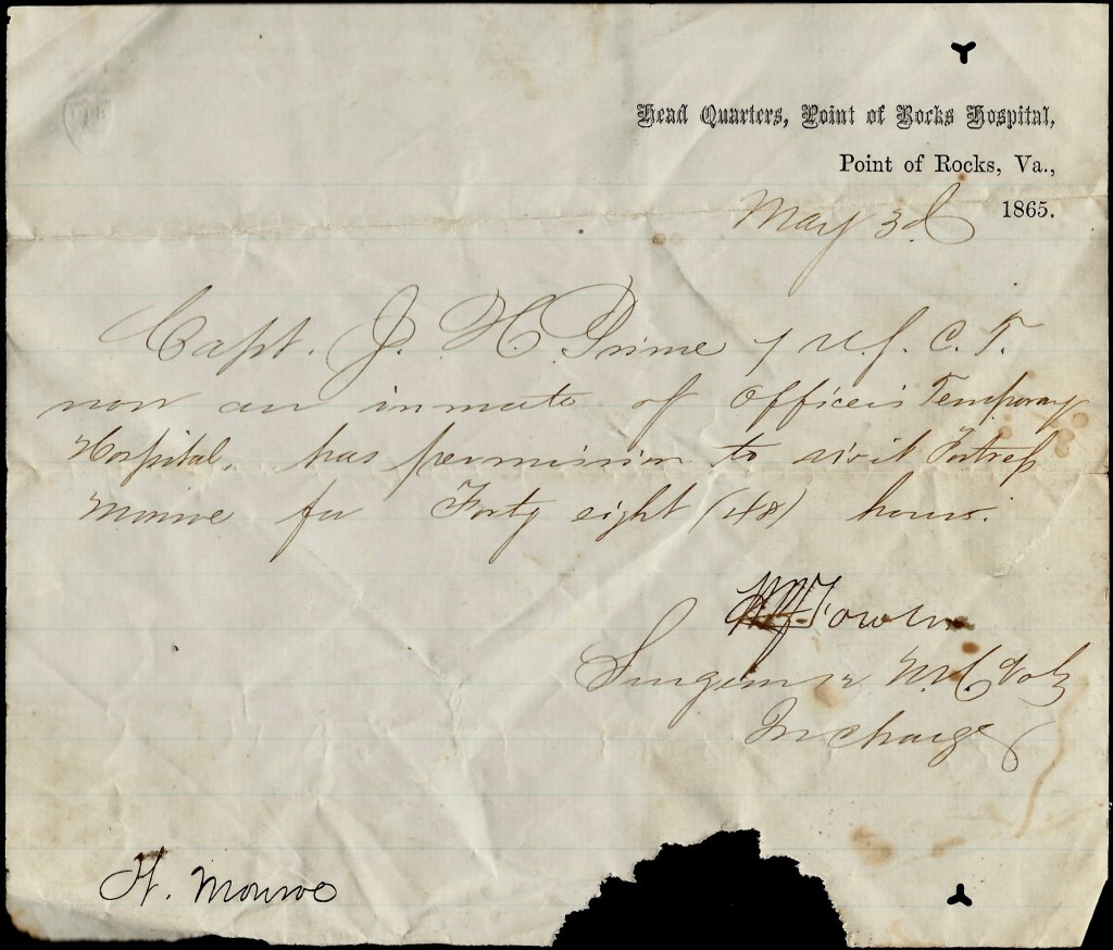 [Included is a pass for Capt. Prime of the 7th USCT of the Officer’s Temporary Hospital at Point of Rocks to visit Fortress Monroe, dated 3 May 1865. The pass was signed by Hadley B. Fowler, Surgeon in charge.]