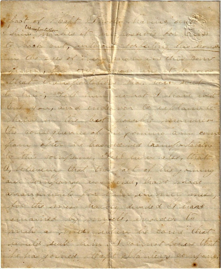 I received yours of the 5th with much pleasure for I had concluded that you had given out writing to me. I received a letter from Sarah yesterday by which I learned that Cousin Joe had joined Capt. Stanley’s company, but I think that surely it must be a mistake for he has irrevocably committed himself to our company, for he even went so far as to send for transportation which Capt. [Washington P.] Shooter sent him. He may have joined Stanley’s company before he received an answer from me after he had applied for transportation, in which case he will have to explain to Capt. Stanley for the fact of Capt. Shooter having sent him transportation makes it impossible for him to back out, without forfeiting his bonds in the eyes of every man in this company for every man in it knows that transportation has been sent to him. Tell him what I have written you, and endeavor to explain to him in the best possible manner the consequences of his joining any company after he has received transportation to this company. Tell him also that I, believing that the fact of his joining our company was fixed, have made arrangements for him in my mess, for the mess being divided I have remained by myself in order to make a mess when he came that would suite him. I cannot believe that he has joined Capt. Stanley’s company, but if he has under the circumstances, it can he settled by his telling Capt. Stanley that after joining his company, he received transportation to Capt. Shooter’s company and therefore he is hound more closely to Shorter than he is to him.