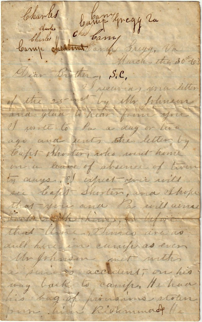 I received your letter of the 25 inst. by Mr. Johnson and glad to hear from you. I wrote to Pa a day or two ago and sent the letter by Capt. Shorter who went home on a leave of absence of twenty days. I expect you will see Capt. Shorter and I hope that you and Pa will come back with him, or before that time. Times are as dull here in camp as ever. Mr. Johnson met with a serious accident on his way back to camp. He had his bag of provisions stolen from him at Richmond. He had a fine supply of rice, potatoes, hams, sausages, team and their loss was a great disappointment to his mess, as well as himself. The drum has beaten for dress parade and I must wait until it is over before I write any more.