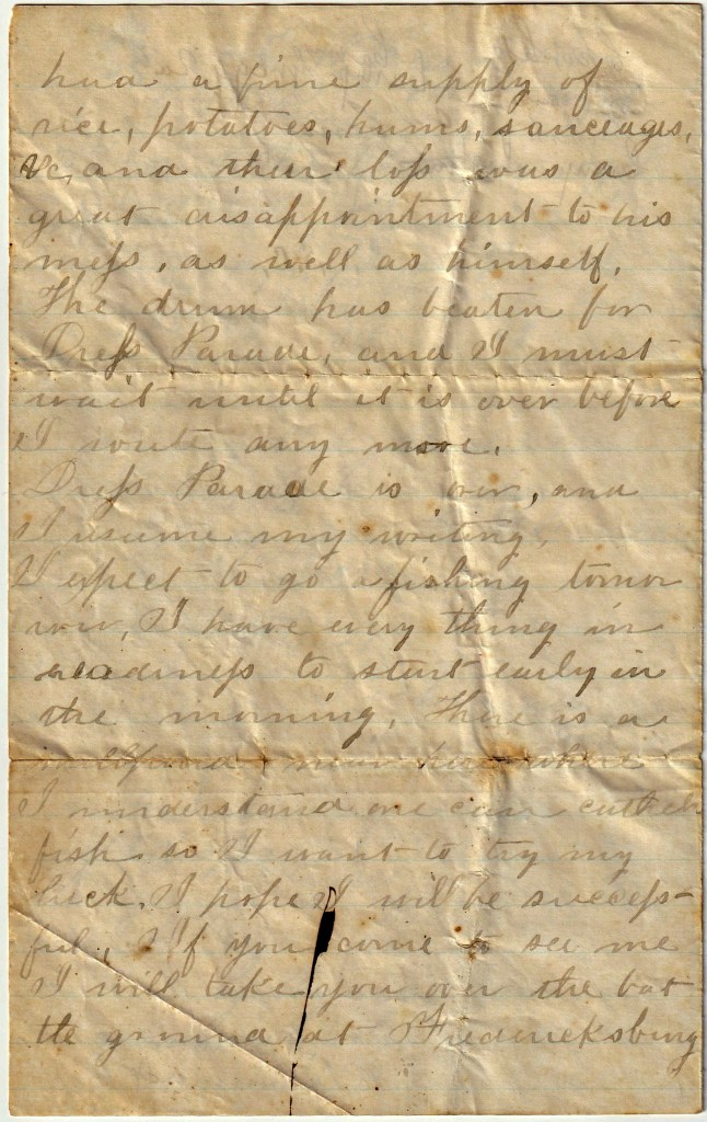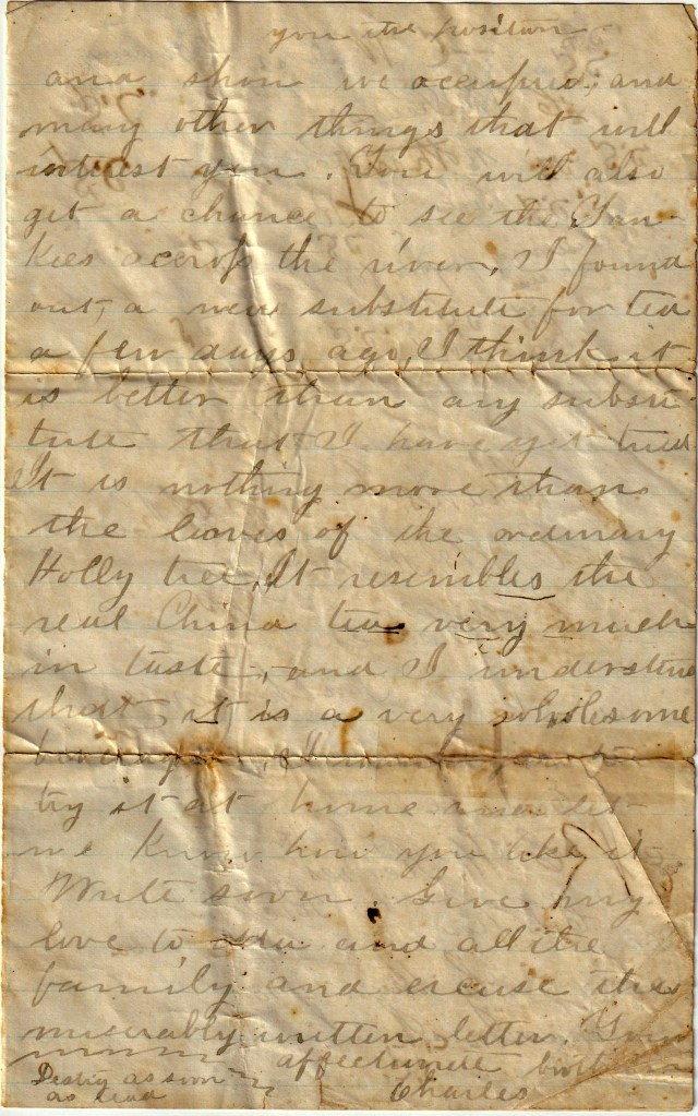 I expect to go fishing tomorrow. I have everything in readiness to start early in the morning. There is a millpond near here where I understand one can catch fish so I want to try my luck. I hope I will be successful. If you come to see me, I will take you over the battleground at Fredericksburg and show you the position we occupied, and many other things that will interest you. You will also get a chance to see the Yankees across the river. I found out a new substitute for tea a few days ago. I think it is better than any substitute that I have yet tried. It is nothing more than the leaves of the ordinary holly tree. It resembles the real China tea very much in taste, and I understand that it is a very wholesome beverage. I encourage you to try it at home and let me know how you like it. Write soon. Give my love to Ma and all the family and excuse the miserably written letter.