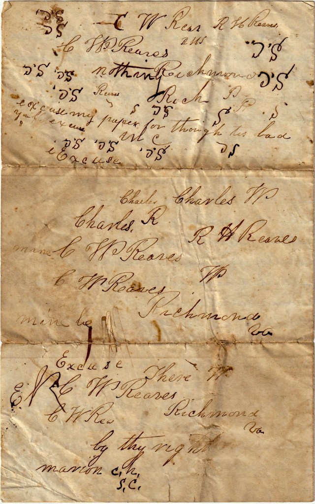 The following letters were written from Charles W. Reaves (1845-1863), the son of Robert Hodge Reaves (1813-1875) and Anna Louisa Grice (1825-1901) of Marion county, South Carolina. He wrote the letters to his younger brother, Robert Hodges Reaves (1846-1865) who later enlisted (March 1864) in Co. H, 21st South Carolina Infantry and was killed in action on 18 June 1864.