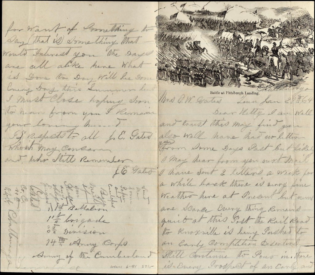 Dear Hetty, I am well and trust this may find you also well. Have had no letter from you [for] some days past but likely I may hear from you next mail. I have sent 2 letters a week for a while back. There is very fine weather here at present but news are scarce. Everything remains quiet at this post. The railroad to Knoxville is being pushed to an early completion. Deserters still continue to pour in. There is every prospect of an early and vigorous campaign in front of this line—that is, I mean the line of the Tennessee. It may be that the storm will burst forth at Knoxville. The Rebels are evidently about to make a desperate effort to retrieve their fortunes in this section of the country and Uncle Sam is making preparations to receive them in a style becoming their chivalry and prestige.