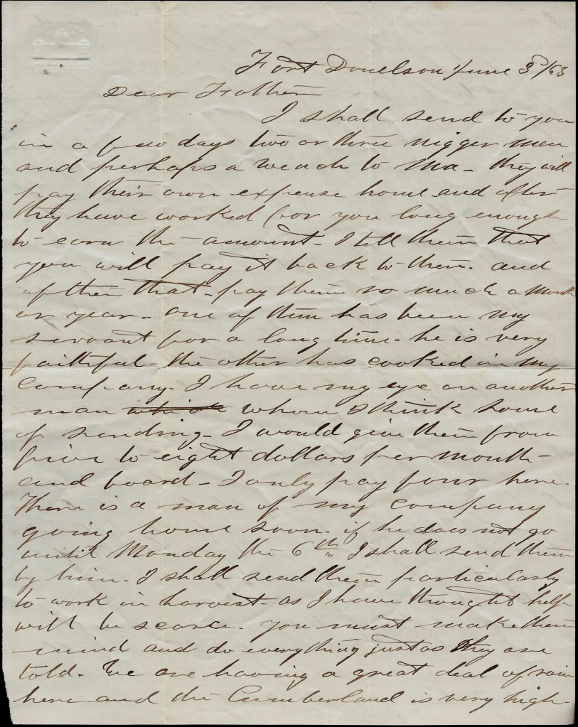 I shall send to you in a few days two or three nigger men and perhaps a wench to Ma. They will pay their own expense home and after they have worked for you long enough to earn the amount, I tell them that you will pay it back to them, and after that, pay them so much a month or year. One of them has been my servant for a long time. He is very faithful. The other has cooked in my company. I have my eye on another man whom I think some of sending. I would give them from five to eight dollars per month and board. I only pay four here. There is a man of my company going home soon. If he does not go until Monday the 6th, I shall send them by him. I shall send them particularly to work in harvest as I have thought help will be scarce. You must make them mind and do everything just as they are told.