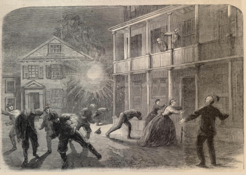 The first shell hit Hayne Street near the Market, narrowly missing the Charleston Hotel. A British visitor recalled, “At first I thought a meteor had fallen, but another awful rush and whir right over the hotel and another explosion beyond, settled any doubts that the city was being shelled.” Beauregard admonished Gillmore: “It would appear sir, that despairing of reducing our works, you now resort to the novel measure of turning your guns against old men, the women and children, and the hospitals of a sleeping city, an act of inexcusable barbarity.” Church steeples became targets for Union artillery, so many closed during the siege for the safety of their parishioners. Newspapers reported that many residents had made a “Grand Skedaddle,” leaving as quickly as they could pack their belongings.