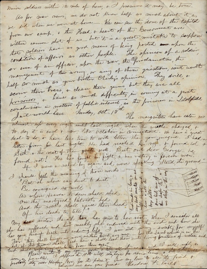 Sunday, Oct. 12th The mosquitoes have eaten us almost up every night until last night when the weather changed, & today it is cool and raw—like October in Connecticut. We have a great deal to do & have less time to write letters than you imagine. I had a letter from Joe last night. He had reached his regiment & found Ed & Seth & the rest of them quite well. But our dear George he found not! He has fought his fight and his victory is forever won. If I were a school boy again and were speaking “Stand the ground” I should feel the meaning of those words. But oh! where can dust to dust be consigned so well, as where Heaven its dews shall shed, on the martyred Patriots bed, and the rocks shall raise their head of his deeds to tell!”