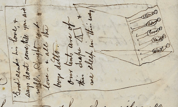P.S. “Good” sends his love & says don’t come till you are well. Wright sends love & all the boys ditto Our tents are of this shape, & we sleep in this way.(Sketch follows)