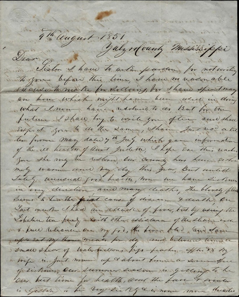 Our county has been extremely warm and very dry this year but until lately, unusual good health. Now we have sickness in every direction and many deaths. The bloody flux seems to be the great cause of disease and death. On last week I had an attack of fever, but by using the Lobelier tea freely—with other assistance of the steam [ ] and full reliance on my God, the fever fled and I am up and eat my three meals per day, and between times a small share of watermelons, figs, peaches, apples, &c. &c. My wife is just now up & about from a severe spell of sickness. Our summer season is getting to be our best time for health, and the fall and winter is getting to be very sick & is now more dreaded than summer ever was.