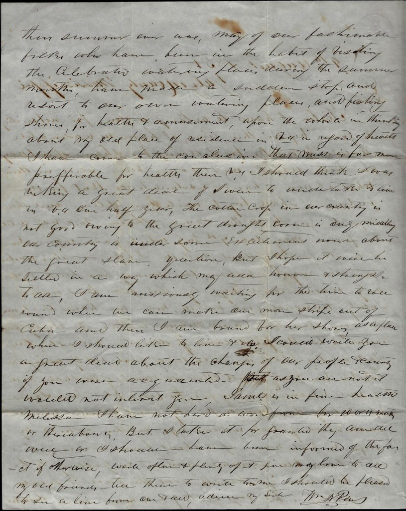 Many of our fashionable folks who have been in the habit of visiting the celebrated watering places during the summer months have made a sudden stop, and resort to our own watering places, and fishing shores for health and amusement. Upon the whole, in thinking about my old place of residence in Virginia in regard of health, I have come to the conclusion that Mississippi is far more preferable for health than Virginia. I should think I was risking a great deal if I were to undertake to live in Virginia one half year. The cotton crop in our country is not good owing to the great drought. Corn in only middling.