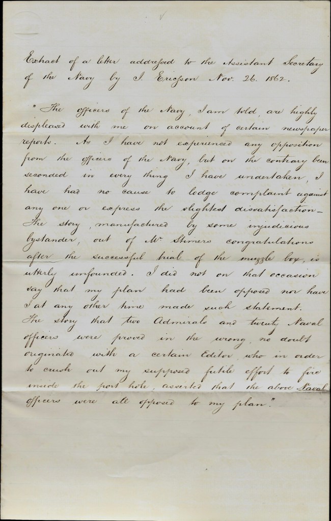Extract of a letter addressed to the Assistant Secretary of the Navy by J. Ericsson, November 26, 1862. Though these are purported to be the words of John Ericsson, I can confirm it is not his handwriting. The document dates to the Civil War period, however.