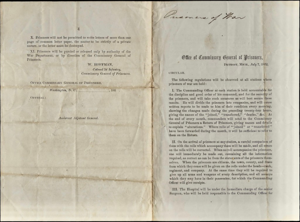 Recognizing the haphazard administration of the various POW camps in the Union, Colonel William Hoffman attempted to impose order through a uniform set of regulations. Of particular interest is the decision to withhold rations, sell the resulting surplus, and create a general prison fund with the proceeds, to improve the conditions for the prisoners.