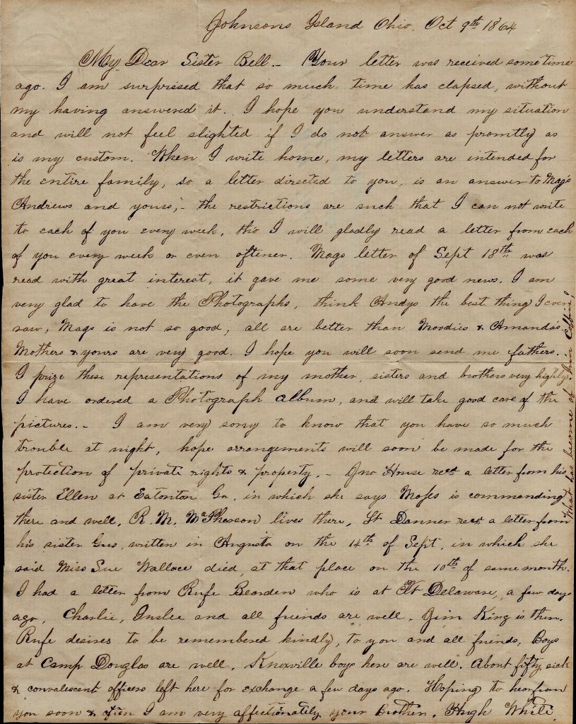Your letter was received sometime ago. I am surprised that so much time has elapsed without my having answered it. I hope you understand my situation and will not feel slighted if I do not answer as promptly as is my custom. When I write home, my letters are intended for the entire family, so a letter directed to you is an answer to Mag’s, Andrew’s and yours. The restrictions are such that I cannot write to each of you each week though I will gladly read a letter from each of you every week or even oftener. Mag’s letter of September 18th was read with great interest. It gave me some very good news. I am very glad to have the photographs. Think Andy’s the best thing I ever saw. Mag’s is not so good. All are better than Moodie’s and Amanda’s. Mother’s and yours are very good. I hope you will soon send me father’s. I prize these representations of my mother, sisters, and brothers very highly. I have ordered a photograph album and will take good care of the pictures. I am very sorry to know that you have so much trouble at night. Hope arrangements will soon be made for the protection of private rights and property. Jno. House received a letter from his sister Ellen at Eatonton, Ga., in which she says [brother] Moses [White] 1 is commanding there and well. R. M. McPherson lives there. Lt. Danner received a letter from his sister Gus, written in Augusta on the 14th of September, in which she said Miss Sue Wallace died at that place on the 10th of same month. I had a letter from Rufe Beardon who is at Ft. Delaware a few days ago. Charlie, Inslee and all friends are well. Jim King is there. Rufe desires to be remembered kindly to you and all friends. Boys at Camp Douglas are well. Knoxville boys here are well. About fifty sick and convalescent officers left here for exchange a few days ago. Hoping to hear from you soon & often. I am very affectionately your brother, — Hugh White