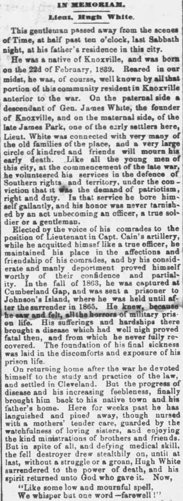 The following letter was written by Hugh Lawson White (1839-1871), the son of Judge George M. White (1800-1884) and Isabella McNutt (1780-1842) of Knoxville, Tennessee. When the Civil War began, “like all the young men of Knoxville,” Hugh volunteered his services “in the defense of Southern rights and territory under the conviction that it was the demand of patriotism, right and duty.” He was elected by his comrades as a Lieutenant in Capt. W. C. Kain’s Light Artillery Company. In the fall of 1863, he was captured at Cumberland Gap and sent a prisoner to Johnson’s Island where he was held until after the surrender in 1865. While in prison, he contracted a disease which impaired him and no doubt prematurely ended his life in 1871. After the war he studied and practiced law for a time but his health failed him.