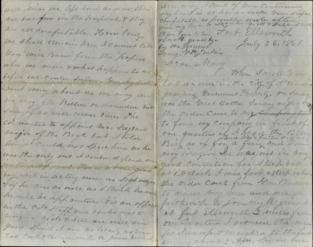 When I wrote you last we were in the city of Alexandria guarding government property. On Sunday was the Great Battle. Sunday night 11 o’clock, the order came to me to form my company in front of our quarters if I heard the bell ring as if for a fire and wait further orders, and you can imagine I was not in very good condition for sleep. But at 1 o’clock I was fast asleep when the order came from Gen. Bunion to arouse my men and march forthwith to join my regiment at Fort Ellsworth, 2 miles from our quarters.