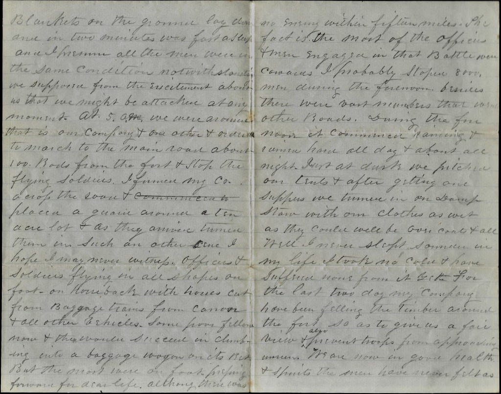 I aroused the men, packed up, & marched to the fort, arriving about 3 a.m. [We] spread our blankets on the ground, lay down, and in two minutes was fast asleep, and I presume all the men were in the same condition notwithstanding we supposed from the excitement about us that we might be attacked at any moment. At 5 a.m. we were aroused—that is, our company and one other—& ordered to march to the main road about 100 rods [550 yards] from the fort & stop the flying soldiers. I formed my company across the road & placed a guard around a ten-acre lot & as they arrived, turned them in. Such another scene I hope I may never witness—officers & soldiers flying in all shapes on foot, on horseback with horses cut from baggage trains, from cannon, & all other vehicles. Some poor fellow now & then would succeed in climbing into a baggage wagon on its bed, but the most were on foot pressing forward for dear life, although there was no enemy within fifteen miles. The fact is, the most of the officers & men engaged in that battle were cowards. I probably stopped 8,000 men during the forenoon besides there were vast numbers that went other roads.