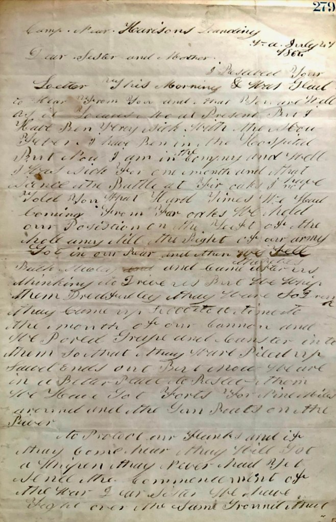 Dear sister, we have fought over the same ground that our forefathers fought and the forts are still here that they made. President Harrison’s house is on the James River where we camped the first day we got here. It has a beautiful view up and down the river, is the house that [Edmund] Ruffin lives in—the first man that fired the first gun against Fort Sumter.