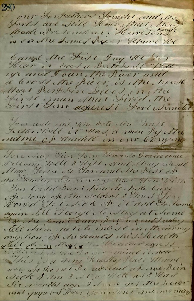 You say give your love to David and William. Well, I will, and they send their love to you and the rest of the family. Also you say that you wish you coulda been here to take care of some of the soldiers. 1 I guess you would get sick of it and go home again. Tell George to stay at home if he can’t earn but 4 cents a day. Tell him not to enlist in the army anyhow if he wants his health. Tell him that the weather agrees with us so we do not mind it now. This is a very healthy place where we are so do not be worried of me being sick. I am just as well as I was six months ago. I have got the letter and paper that you sent me Monday. When you send the box, put anything in that you have a mind to. Please do put in a salt fish and some whiskey.