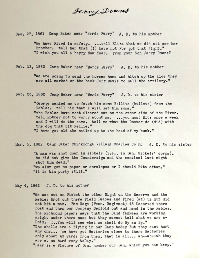 “I have got old abe nailed up to the head of my Bunk,”—the title of a brief biographical sketch of Pvt. Jeremiah Downs prepared by historian Patrick Leary decades ago after perusing and taking notes on eight of Jeremiah’s war time letters. Leary’s sketch reads:
