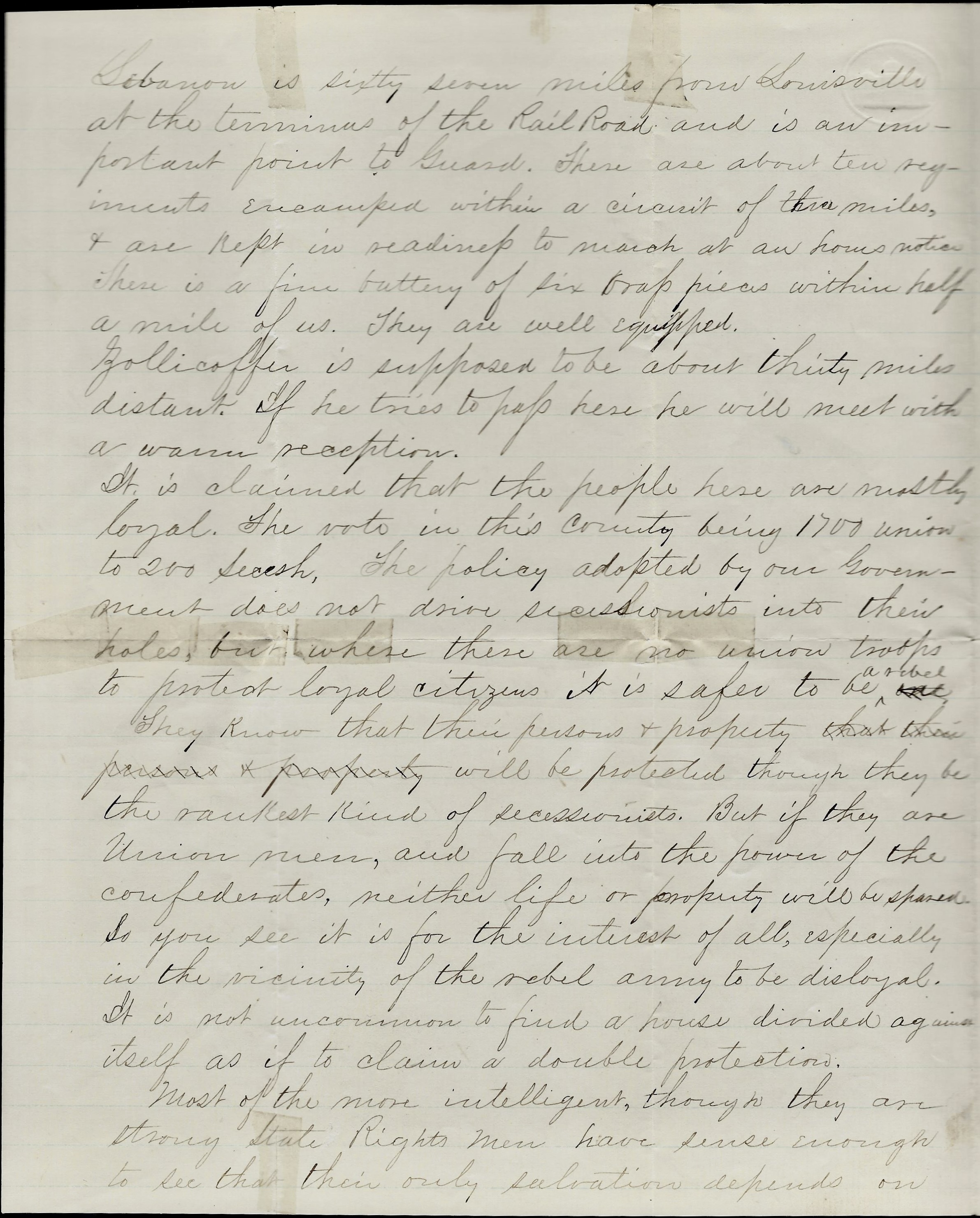 It is claimed that the people here are mostly loyal—the vote in this county being 1700 union to 200 secesh. The policy adopted by our Government does not drive secessionists into their holes, but where there are no union troops to protect loyal citizens, it is safer to be a rebel. They know that their persons & property will be protected though they be the rankest kind of secessionists. But if they are Union men, and fall into the power of the confederates, neither life or property will be spared. So you see it is for the interest of all—especially in the vicinity of the rebel army—to be disloyal. It is not uncommon to find a house divided against itself as if to claim a double protection. Most of the more intelligent, though they are strong state rights men, have sense enough to see that their only salvation depends on the maintenance of the Union.