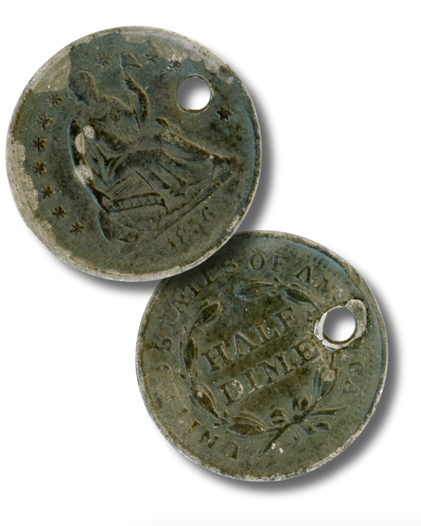In addition to the 1864 letter, there are two letters from 1882—one of which speaks of his plans to go and see bank robber Frank James in prison—and an 1856 Seated Liberty half dime Enos or Katie might have worn as a pendant.