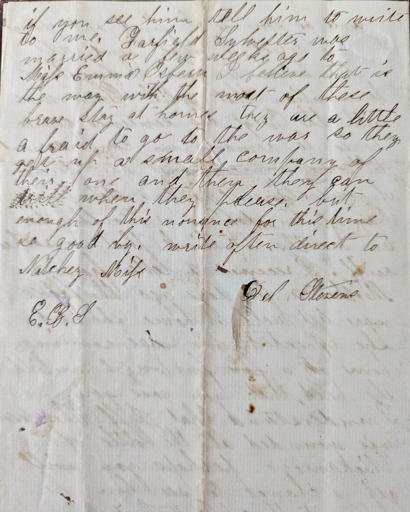 Garfield Sylvester was married a few weeks ago to Miss Osbern. I believe that is the way with the most of these brave stay-at-homes. They are a little afraid to go to the war so they get up a small company of their own and then they can drill when they please. But enough of this nonsense for his time. So goodbye. Write often. Direct to Natchez, Miss. — Del Stevens