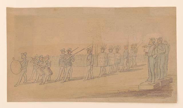 I can’t tell when we will leave here. I think ere long though I can’t [tell] where we will land, but you will hear it. Don’t make any difference. You can write just as well. It will come anyhow. The Regimental Guards have been taken off. We get some rest. Yesterday you might have seen soldiers walking round in army with a rail on their back for not being here at roll call. It was a good sight but a [ ] to those that carried the rail. One man refused and was pulled out his tent, throwed down, and tied. So you see we must come to toe.