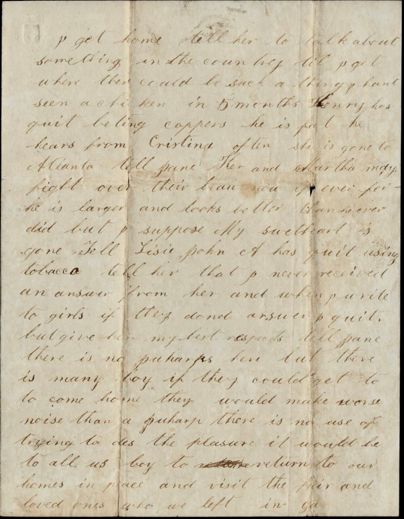 Henry has quit beating coppers. He is fat. He hears from Cristina often. She is gone to Atlanta. Tell Jane her and Martha may fight over their beau now if ever for he is larger and looks better than he ever did but I suppose my sweetheart is gone. Tell Lisa, John A. has quit using tobacco. Tell her that I never received and answer from her and when I write to girls, if they don’t answer, I quit. But give her my best respects. Tell Jane there is no jews harps here but there is many boys if they could get to come home they would make worse noise than a jews harp. There is no use of trying to des the pleasure it would be to all us boys to return to our home in peace and visit the fair and loved ones who we left in Georgia.