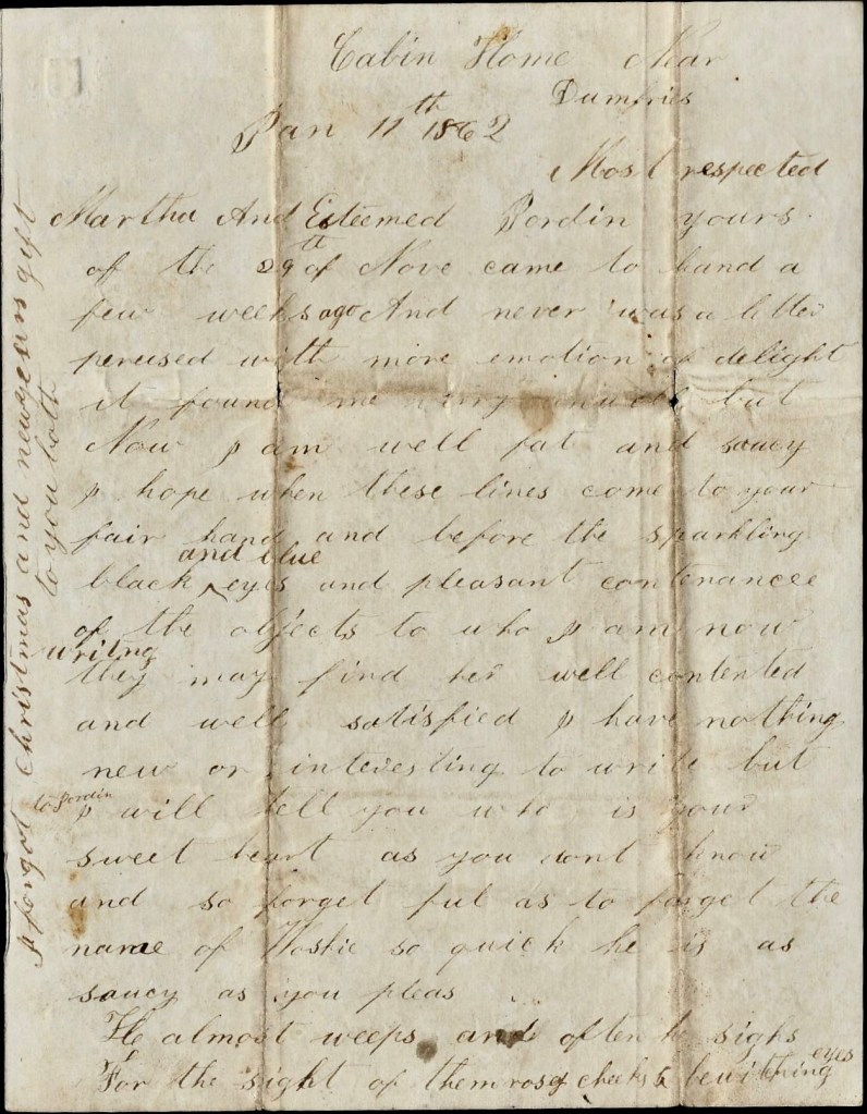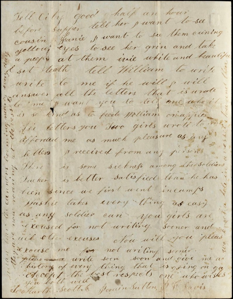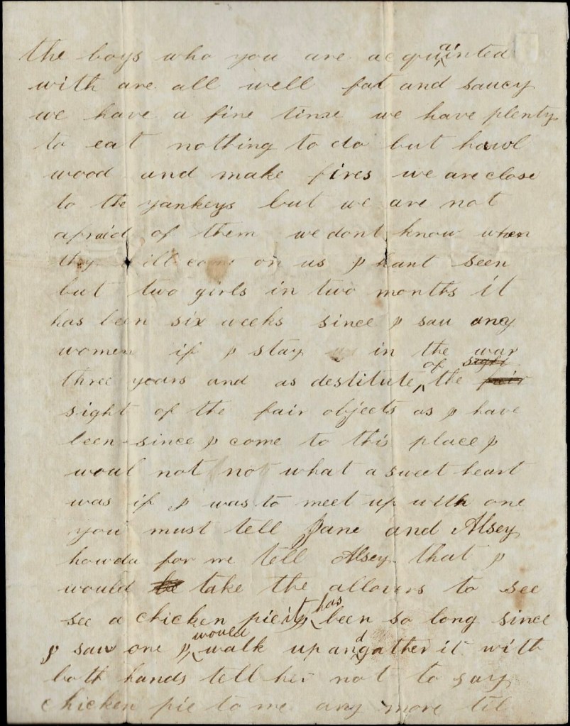I han’t seen but two girls in two months, It has been six weeks since I saw any women. If I stay in the war three years and as destitute of the sight of the fair objects as I have been since I came to this place, I would not know what a sweet heart was if I was to meet up with one. You must tell Jane and Alsey howda for me. Tell Alsey that I would take the allovers to see a chicken pie—it has been so long since I saw one. I would walk up and gather it with both hands. Tell her not to say chicken pie to me any more till I get home. Tell her to talk about something in the country till I get where there could be such a thing. I han’t seen a chicken in 5 months.