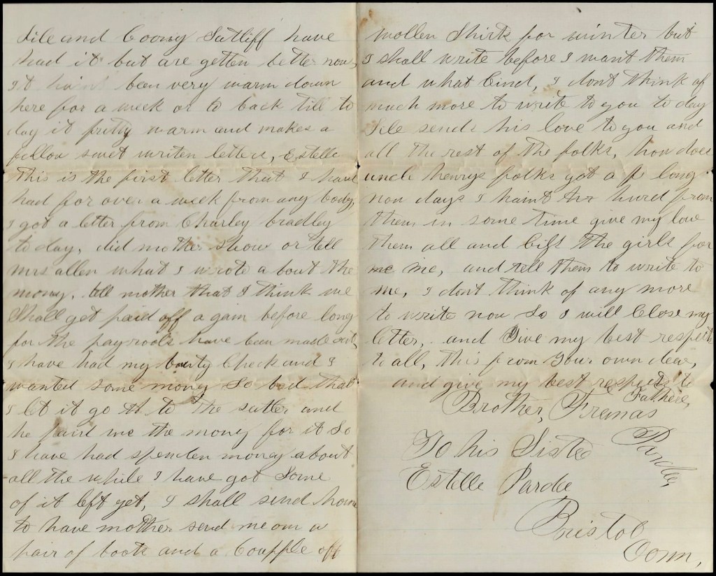It hain’t been very warm down here for a week or two back till today it’s pretty warm and makes a fellow sweat writing letters. Estelle, ths is the first letter that I have had for over a week from anybody. I got a letter from CHarley Bradley today. Did mother show or tell Mrs. Allen what I wrote about the money> Tell mother that I think we shall get paid off again before long for the pay rolls have been made out. I have had my bounty check and I wanted some money so bad that I let it go to the sutler and he paid me the money for it so I have had spending money about all the while. I have got some of it left yet. I shall send home to have mother send me one pair of boots and a couple of woolen shirts for winter. But I shall write before I want them and what kind.