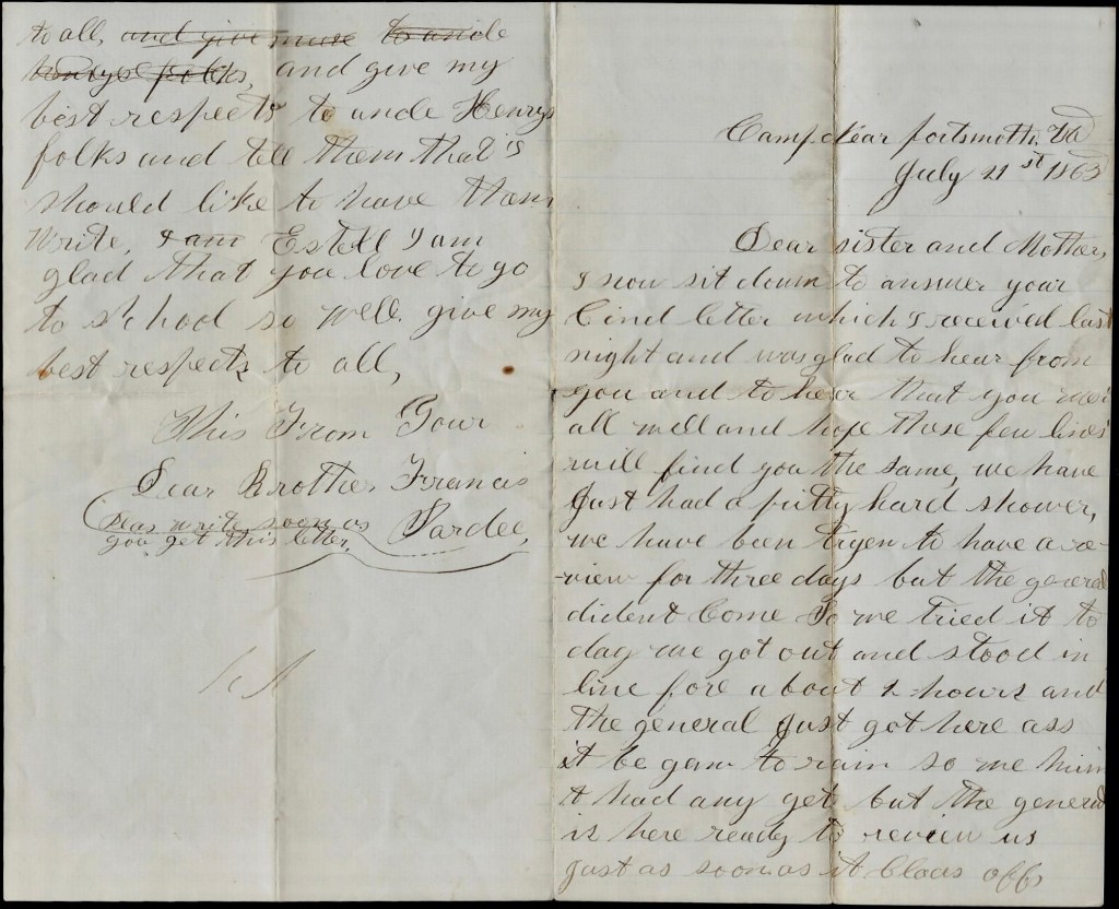 The story is now that we are a going to have Thanksgiving here next month and we have been to work fixing up the camp ever since we got back from the march. I have not heard from Father since I wrote to him to the White House, and I hain’t had any answer from it yet. I should have wrote to Uncle James before but I did not know [how] to direct the letters so I didn’t write. I wrote one when I was up to Suffolk but didn’t know how to direct it so I didn’t send it. I have wrote to Amelia and Lib since I got back and one to Ed day before yesterday. Please send the box as soon as you can and direct it to Portsmouth, Va., and when you don’t know where we are, direct them to Washington the same as you use to. But now direct them to Portsmouth for they will come through sooner. They say we ain’t a going to get our pay again under two months from this time but I don’t know the reason why. Give my best respects to grandmother and tell her that I am all right yet, and tell that I should like to have her write to me and I will do the same. And tell Uncle Henry’s folks that Sile is well and sends his best respects to all. And give my respects to Uncle Henry’s folks and tell them that I should like to have them write. Estelle, I am glad that you love to go to school so well. Give my best respects to all. This from your dear brother Francis Pardee