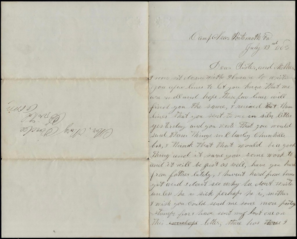 We are within 21 miles of Richmond and I guess that it is about as near as we ever shall get too. You spoke about the men being afraid that they would be drafted. I hope they will draft the right ones when they do draft. Sile is well and is writing to Amelia to put in with mine. I thank you very much for them postage stamps which you sent to me in your letter. I wish you could send me a little money for we don’t get much to eat now since we left Portsmouth and if you could send me a little box with dried beef, it would go first rate on a march—and a couple of calico shirts for I hain’t got but one shirt in the world.