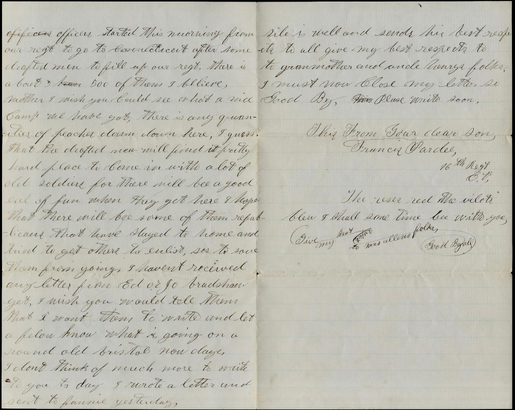 I must now close my letter so goodbye. Give my respects to all and write as soon as you get this letter. This from your son, — Francis Pardee, 16th CT. V. M.