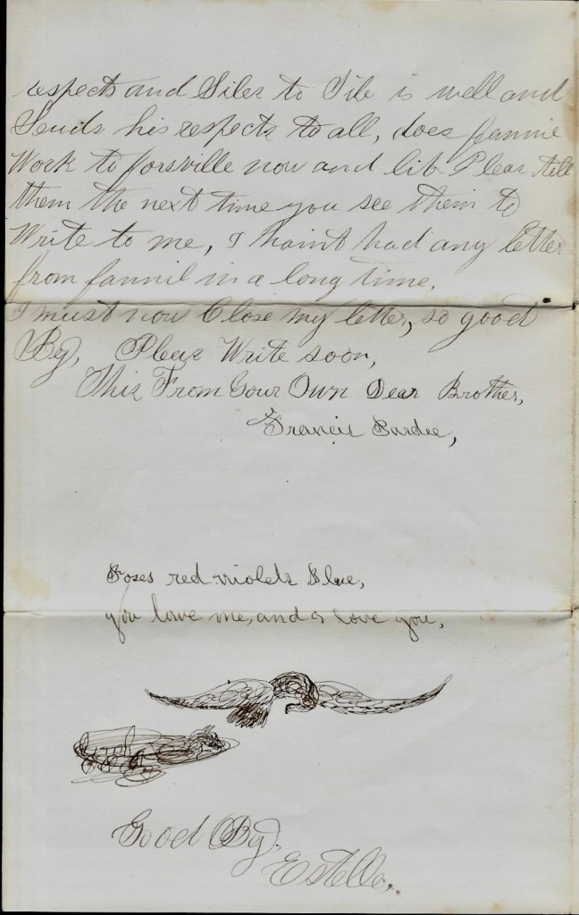 You wanted to know what number my boots wanted to be. I want number 7s and I wrote in the other letter that I wanted a vest for it is getting pretty chilly down here and it’s pretty cold night down here. I am sorry that Amelia is so sick and hope she will get well before long. Please tell father that I want him to write to me and give him my best respects and Siles too. Sile is well and sends his respects to all. Does Fannie work to Forsville now, and Lib? Tell them the next time you see them to write to me. I hain’t had any letters from family in a long time. I must now close my letter. So goodbye. Please write soon. This from your own dear brother, — Francis Pardee