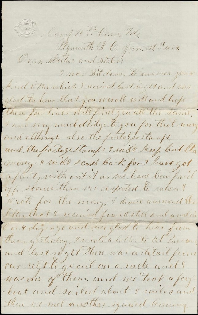 I now sit down with pleasure to write you a few lines to let you know that we are well and hope these few miles will find you the same. I received them lines that you sent to me in Sile’s letter yesterday and you wrote that you would send them things in Charley Churchill’s box. I think that that would be a good thing and it saves you some work too, and it will be just as well. Have you heard from father lately? I haven’t heard from him yet and I don’t see why he don’t write unless he is sick. Perhaps he is. Mother, I wish you could send me some more postage stamps for I have sent my last one on this letter. There has two officers started this morning from our regiment to go to Connecticut after some drafted men to fill up our regiment. There is about 500 of them, I believe.