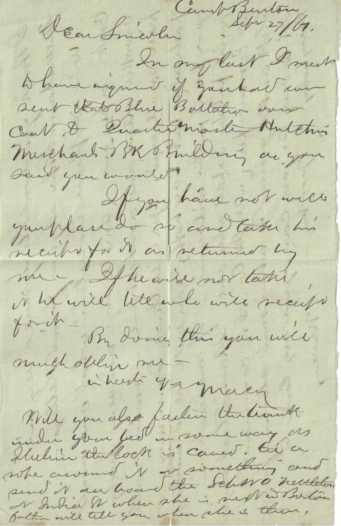 In my last I meant to have inquired if you had ever sent that Blue Battalion over coat to Quartermaster Hutchins, Merchants RR Building, as you said you would. If you have not, will you please do so and take his receipt for it as returned by me. If he will not take it, he will tell who will receipt for it. By doing this, you will much oblige me.