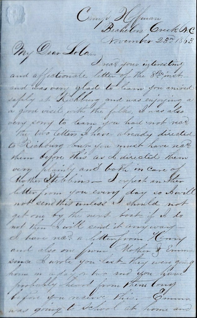 I don’t think there is the slightest danger of my receiving any letter from New York so I shall not have to answer any. I don’t want anything to do with the party till there is an entire change in the programme. We don’t have any “war news” here. It seems more like a foreign country than any place I was ever in yet in my life. We have thirty men on picket out of the whole regiment. They stand on different roads out of camp from five to seven miles out. Last night four rebel deserters came to our outposts. They were recently at Charleston and have managed to get away here.