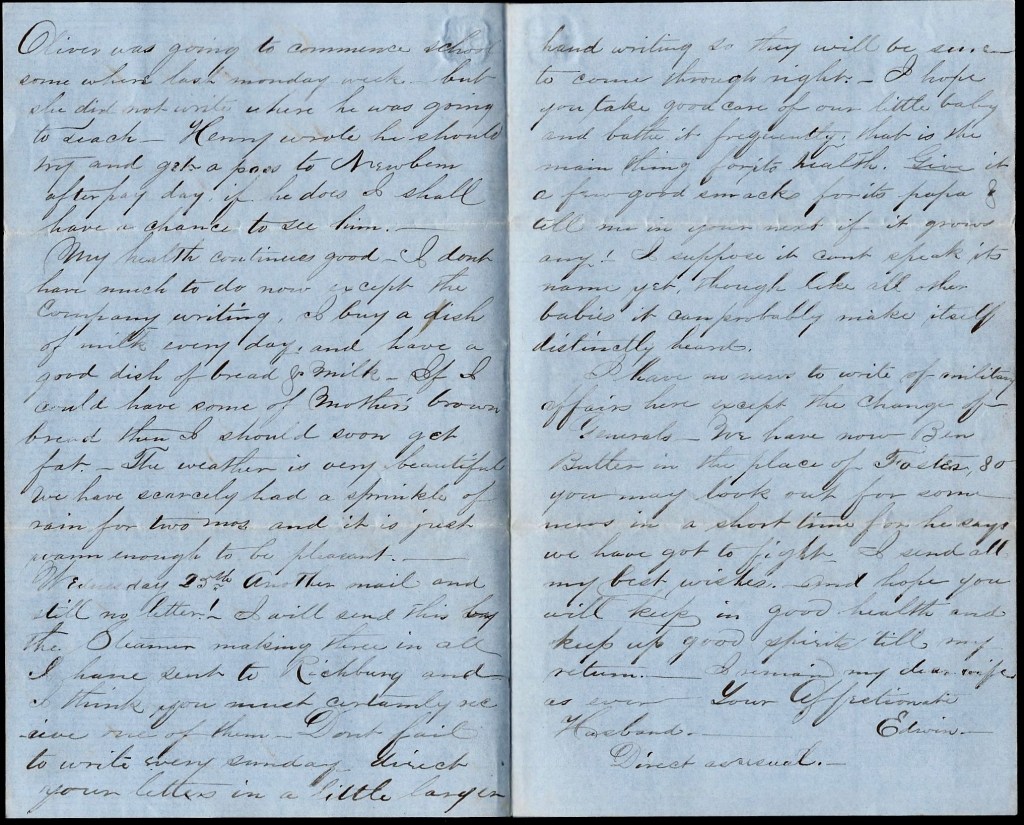 I have not heard from Henry in some time. I believe though I owe him a letter so I must write him soon. It isn’t time to give our little baby a name yet, Wait till she can say mama, papa, & aunty. I hope you won’t kiss it to death because I want a chance when the war is over to have a smack. Give it plenty of warm clothing, fresh air, and bathe it all over every day. Be very particular with yourself about diet and exposure. For the little one will be very likely be sick every time its mama is.