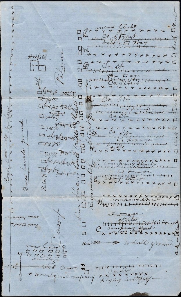 On the opposite side of this you will find a rough plan of a cavalry camp. * The Howitzer Company or Flying Artillery is formed by detached men belonging to the other companies. They have only two small pieces (brass 6 lbs. shot & shells). They go on the run & are intended to go along with cavalry. All the gunners are mounted so they can all keep up. The stables are made of pine poles covered with brush. The horses stand upon each side of the log mangers in each company. The tents of the men front the stables and are eight feet apart. The cook tents are on the back end of the row. The line officers’ tents all front their companies. The Field & Staff tents all front the same way—that is, in this camp south. It looks very pleasant in the evening to see so many tents all lighted up. We have quiet evenings now but we have to go to bed at half past eight and up at five. — E