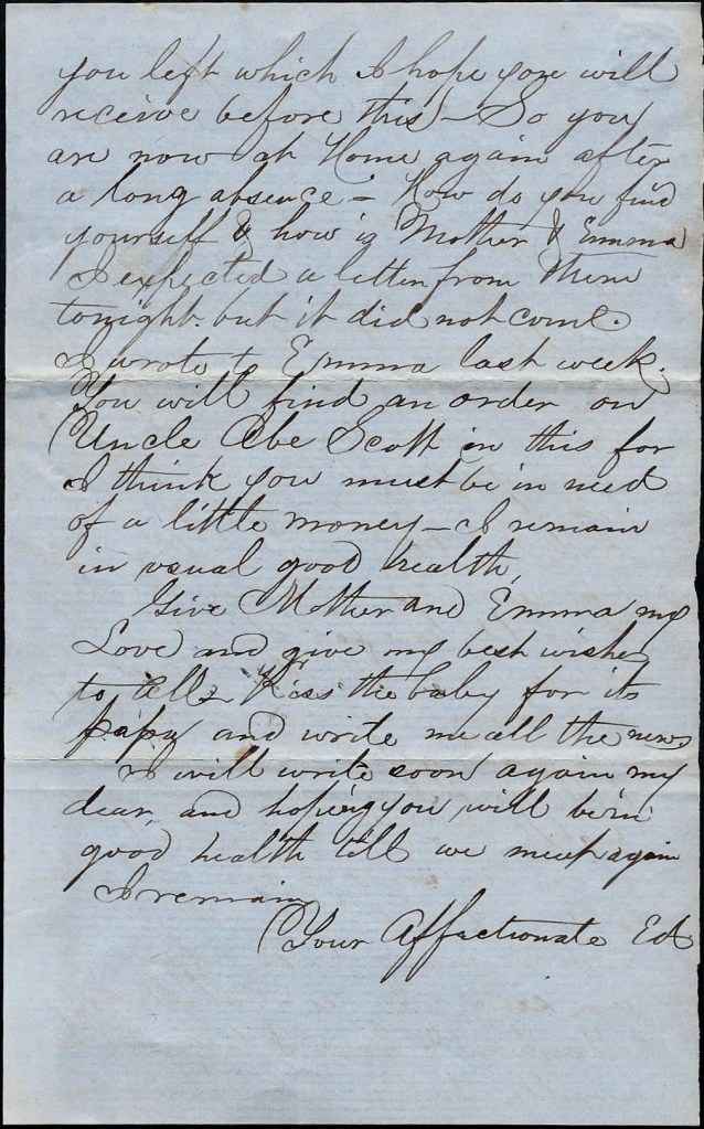I have written twice to Richburg since you left which I hope you will receive before this. So you are now at home again after a long absence. How do you find yourself & how is mother & Emma? I expected a letter from them tonight but it did not come. I wrote to Emma last week. You will find an order on Uncle Abe Scott in this for I think you must be in need of a little money. I remain in usual good health.