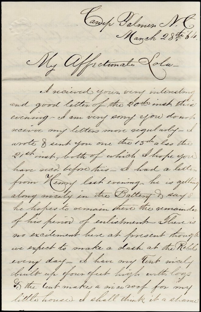 Monday morning, April 13th. My dear bride, it is a little cooler this morning—just enough so to make a little fire comfortable. And as we have all been to breakfast, will write you a few more lines before ending this. Lieut. Stevens is going over to New York today but I can’t go today as I have other business on hand. I have not heard a word from our brother Henry. If you have, write me where he was and how he gets along.