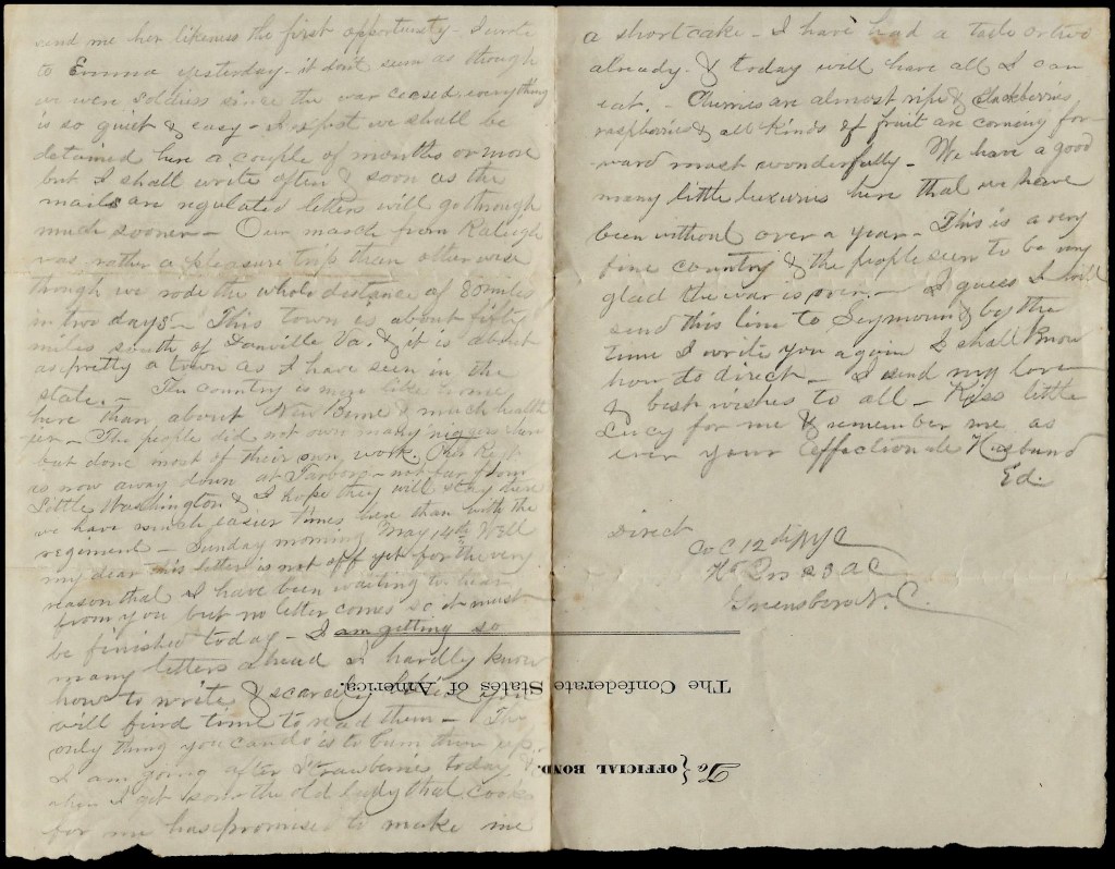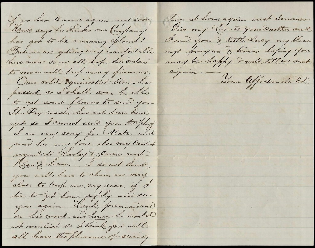 I hope you will keep up good courage for I think things look more favorable for a close of the war than they have for a long time. Give my love to Mother & Emma—and all of you read this and write me a long letter. Give my best wishes to all our friends and relatives. Hoping you may keep up good courage and have continued good health till we meet again, I remain my dear girl your affectionate husband, — Ed