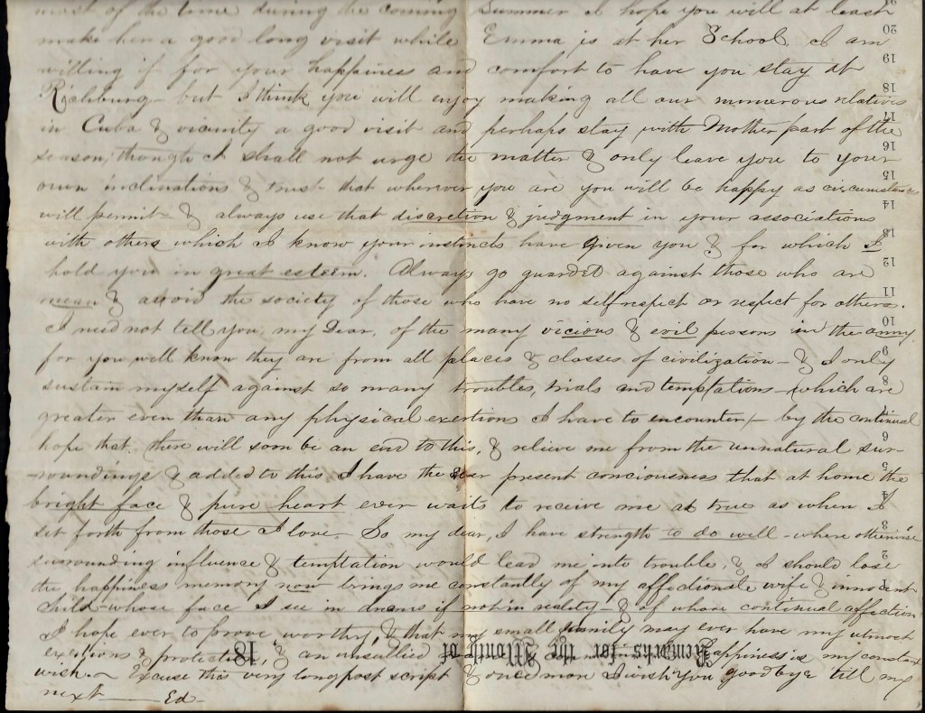 P. S. You must let me know how you get on for money & if there is anything else that I can do to add to your comfort, As Mother will be alone most of the time during the coming summer, I hope you will at least make her a good long visit while Emma is at her school. I am willing if for your happiness and comfort to have you stay at Richburg, but I think you will enjoy making all our numerous relations in Cuba & vicinity a good visit and perhaps stay with Mother part of the season; though I shall not urge the matter & only leave you to your own inclinations & trust that wherever you are, you will be happy as circumstances will permit & always use that discretion & judgement in your associations with others which I know your instincts have given you & for which I hold you in great esteem. Always go guarded against those who are mean & avoid the society of those who have no self respect or neglect for others. I need not tell you, my dear, of the many vicious & evil persons in the army for you well know they are from all places & classes of civilization. And I only sustain myself against so many troubles, trials and temptations which are greater even than any physical exertions I have to encounter, by the continual hope that there will soon be an end to this, & relieve me from the unnatural surroundings. And added to this, I have the ever present consciousness that at home the bright face & pure heart ever waits to receive me, as true as when I set forth from those I love. So my dear, I have strength to do well where otherwise surrounding influence & tempation would lead me into trouble, & I should lose the happiness memory now brings me constantly of my affectionate wife & innocent child, whose face I see in dreams if not in reality, & of whose continual affection I hope ever to prove worthy, & that my small family may ever have my utmost exertions & protection & an unsullied name.
