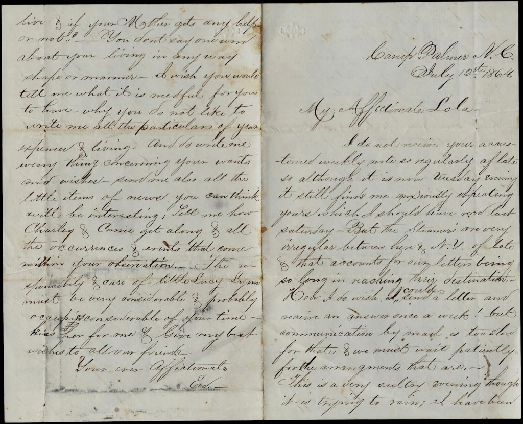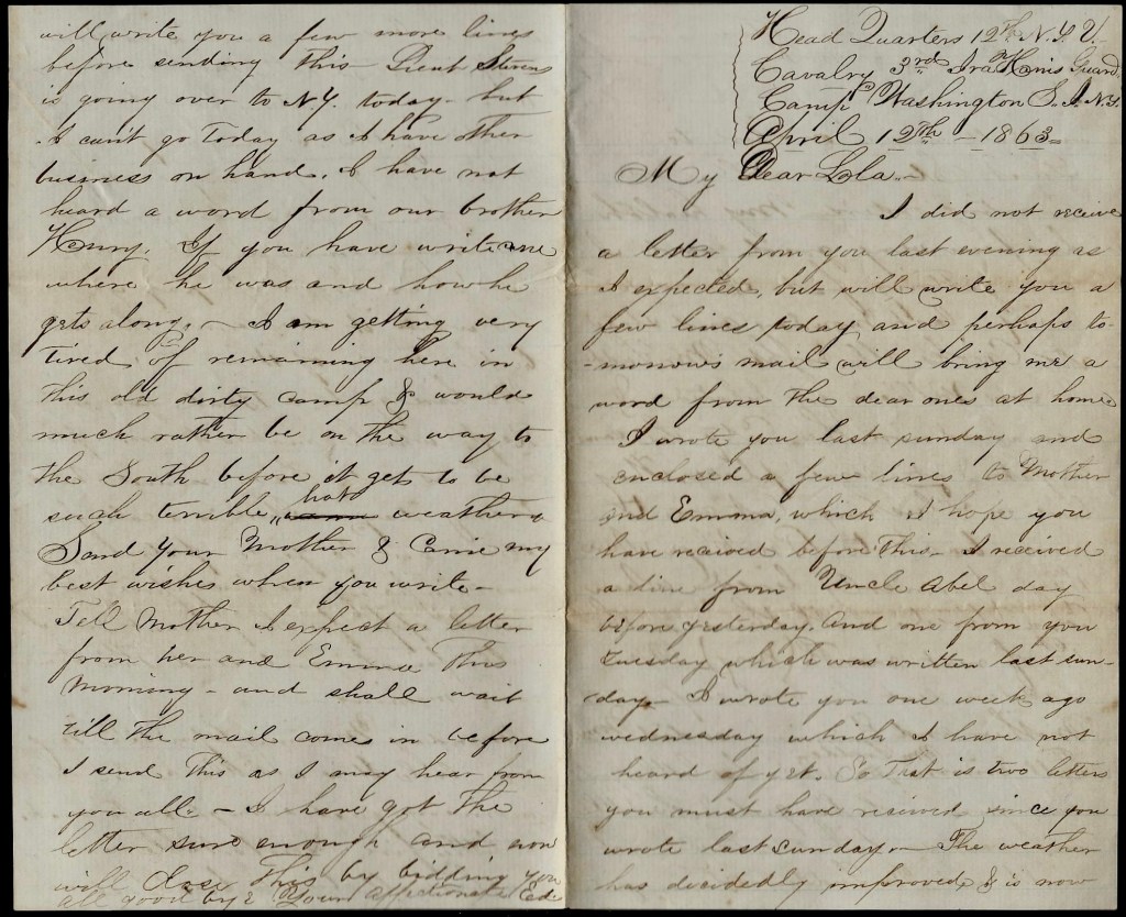 I send you all my love and best wishes and hope to see you when this war is over safe and well. I shall expect a long letter from you by return mail. It takes long [so] I shall expect you to be very punctual. Direct Co. C (instead of Co. D), 12th NYV Cavalry. Camp Harris, Newbern, NC