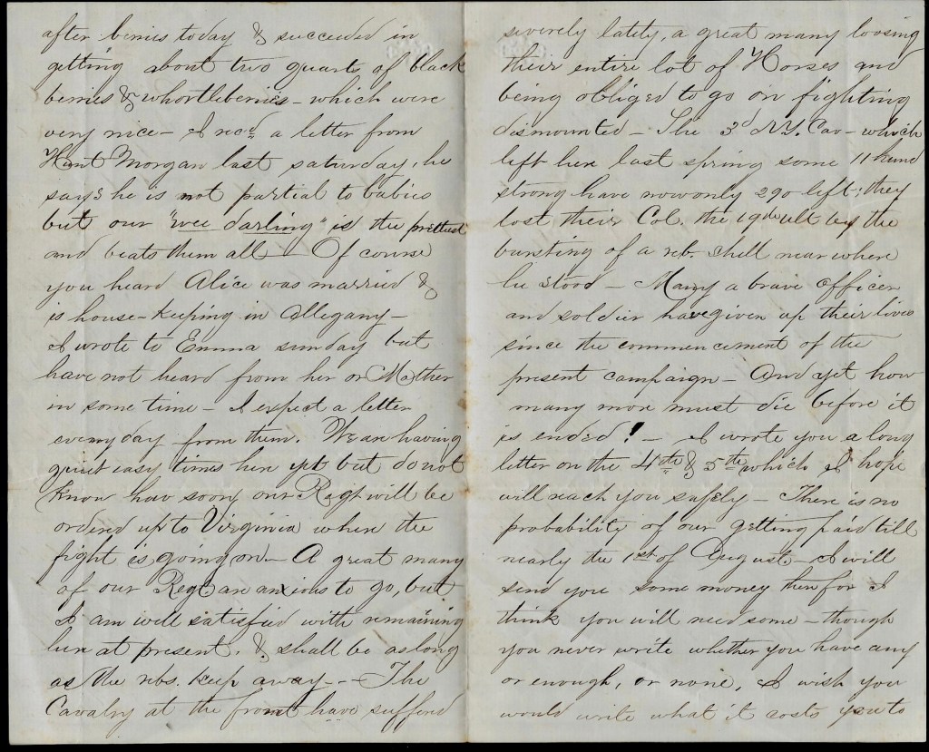 We are having quiet, easy times here yet but do not know how soon our regiment will be ordered up to Virginia where the fight is going on. A great many of our regiment are anxious to go but I am well satisfied with remaining here at present & shall be as long as the rebs keep away. The cavalry at the front have suffered severely lately, a great many losing their entire lot of horses and being obliged to go on fighting dismounted. The 3rd New York Cavalry which left here last spring some 11 hundred strong have now only 290 left. They lost their Colonel the 19th ult. by the bursting of a reb shell near where he stood. Many a brave officer and soldier have given up their lives since the commencement of the present campaign. And yet how many more must die before it is ended!