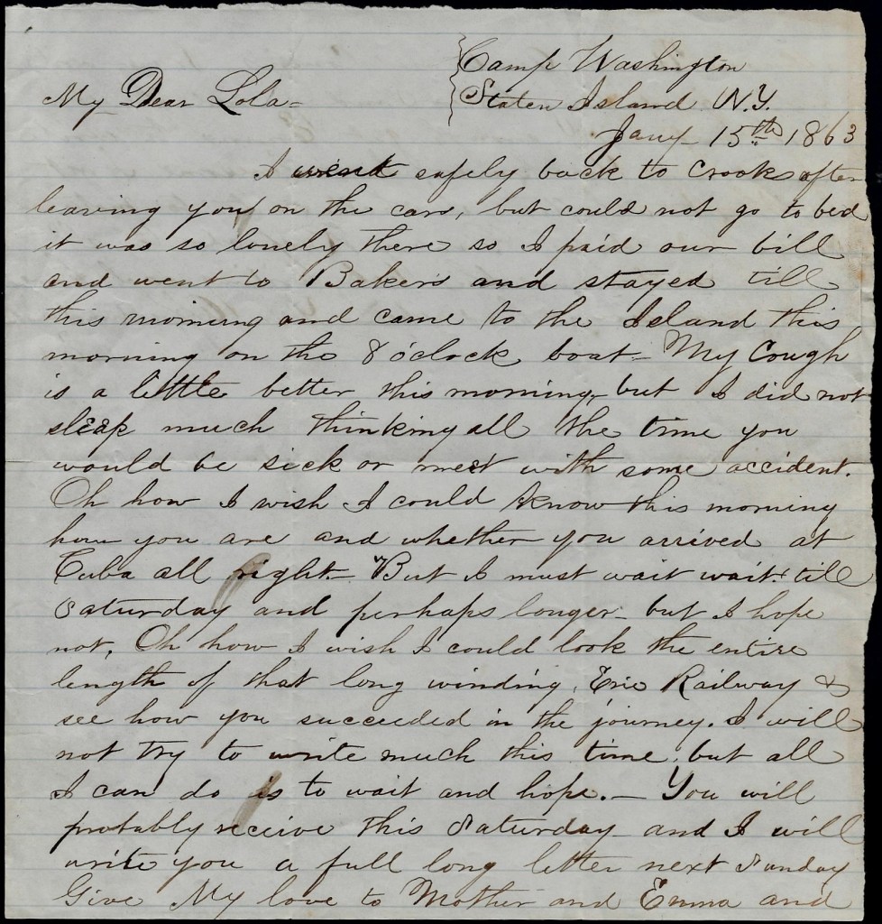 I went safely back to Crooks after leaving you on the cars, but could not go to bed—it was so lonely there—so I paid my our bill and went to Baker’s and stayed till this morning and came to the Island this morning on the 8 o’clock boat. My cough is a little better this morning but I did not sleep much thinking all the time you would be sick or meet with some accident. Oh how I wish I could know this morning how you are and whether you arrived at Cuba all right. But I must wait till Saturday and perhaps longer, nut I hope not. Oh how I wish I could look the entire length of that long winding Erie Railway & see how you succeeded in the journey. I will not try to write much this time but all I can do is to wait and hope. You will probably receive his Saturday and I will write you a full long letter next Sunday.